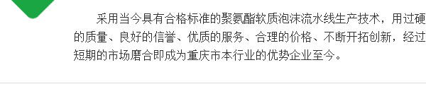我公司以“信誉求发展,质量求生存”的营销理念,融合了本公司及同行业多年的经验,采用当今具有合格标准的聚氨酯软质泡沫流水线生产技术,用过硬的质量、良好的信誉、优质的服务、合理的价格、不断开拓创新,经过短期的市场磨合即成为重庆市本行业的优势企业至今。…